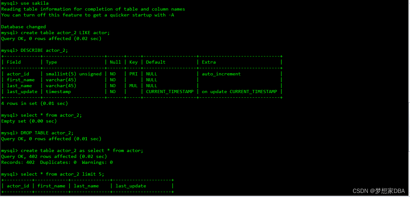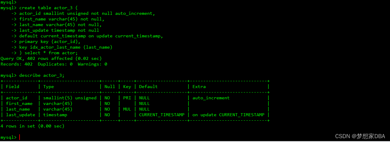 mysql> insert into actor select actor_id+400,first_name,last_name,now() from actor;