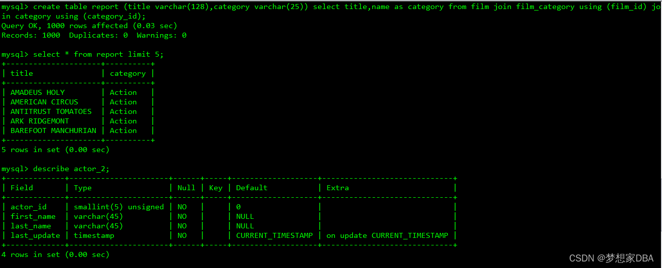 | 1 | SIMPLE | film | NULL | ref | PRIMARY,idx_title | idx_title | 514 | const | 1 | 100.00 | Using index; Start temporary |