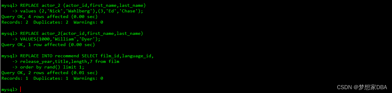 mysql> REPLACE INTO actor_2 (actor_id, first_name,last_name)