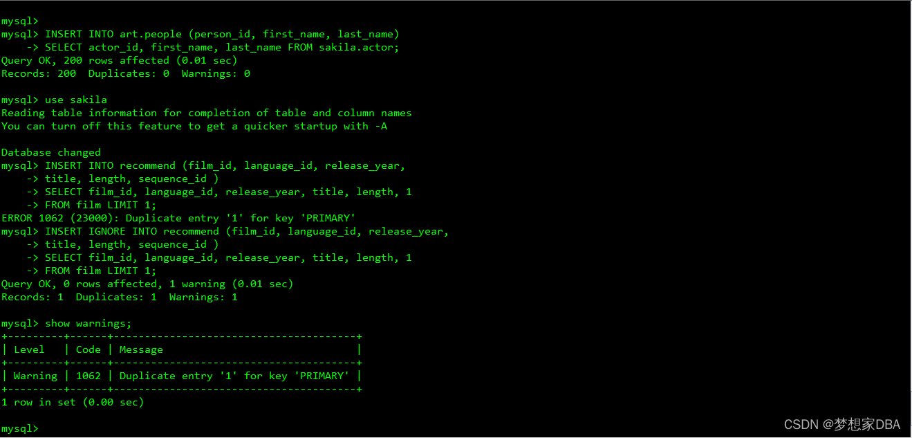 mysql> INSERT IGNORE INTO recommend (film_id, language_id, release_year,