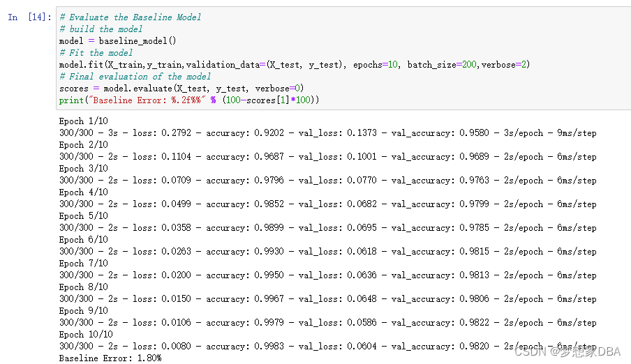 Epoch 1/10 300/300 - 2s - loss: 0.2769 - accuracy: 0.9209 - val_loss: 0.1445 - val_accuracy: 0.9579 - 2s/epoch - 8ms/step Epoch 2/10 300/300 - 2s - loss: 0.1110 - accuracy: 0.9681 - val_loss: 0.1003 - val_accuracy: 0.9698 - 2s/epoch - 6ms/step Epoch 3/10 300/300 - 2s - loss: 0.0702 - accuracy: 0.9797 - val_loss: 0.0768 - val_accuracy: 0.9772 - 2s/epoch - 6ms/step Epoch 4/10 300/300 - 2s - loss: 0.0493 - accuracy: 0.9857 - val_loss: 0.0760 - val_accuracy: 0.9761 - 2s/epoch - 6ms/step Epoch 5/10 300/300 - 2s - loss: 0.0353 - accuracy: 0.9903 - val_loss: 0.0671 - val_accuracy: 0.9791 - 2s/epoch - 7ms/step Epoch 6/10 300/300 - 2s - loss: 0.0276 - accuracy: 0.9926 - val_loss: 0.0658 - val_accuracy: 0.9809 - 2s/epoch - 6ms/step Epoch 7/10 300/300 - 2s - loss: 0.0194 - accuracy: 0.9950 - val_loss: 0.0614 - val_accuracy: 0.9807 - 2s/epoch - 6ms/step Epoch 8/10 300/300 - 2s - loss: 0.0142 - accuracy: 0.9968 - val_loss: 0.0605 - val_accuracy: 0.9817 - 2s/epoch - 6ms/step Epoch 9/10 300/300 - 2s - loss: 0.0108 - accuracy: 0.9976 - val_loss: 0.0630 - val_accuracy: 0.9812 - 2s/epoch - 8ms/step Epoch 10/10 300/300 - 2s - loss: 0.0077 - accuracy: 0.9985 - val_loss: 0.0638 - val_accuracy: 0.9808 - 2s/epoch - 6ms/step Baseline Error: 1.92%