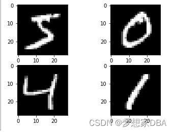 The Keras deep learning library provides a convenience method for loading the MNIST dataset. The dataset is downloaded automatically the first time this function is called and is stored in your home directory in ~/.keras/datasets/mnist.pkl.gz as a 15 megabyte file. This is very handy for developing and testing deep learning models. To demonstrate how easy it is to load the MNIST dataset, we will first write a little script to download and visualize the first 4 images in the training dataset.