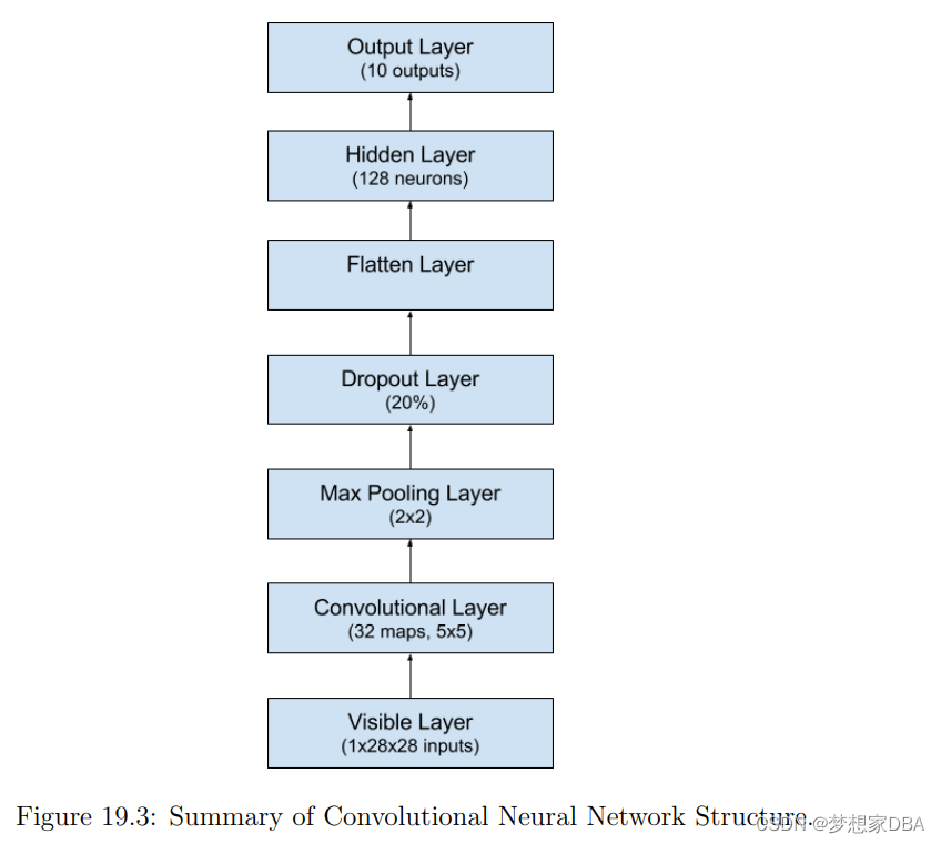Next we define our neural network model. Convolutional neural networks are more complex than standard Multilayer Perceptrons, so we will start by using a simple structure to begin with that uses all of the elements for state-of-the-art results. Below summarizes the network architecture. 1. The first hidden layer is a convolutional layer called a Convolution2D. The layer has 32 feature maps, which with the size of 5 ⇥ 5 and a rectifier activation function. This is the input layer, expecting images with the structure outline above.