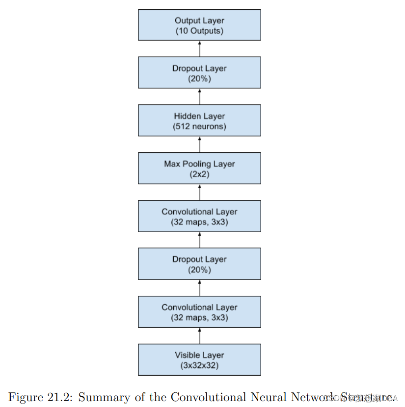 Let’s start off by defining a simple CNN structure as a baseline and evaluate how well it performs on the problem. We will use a structure with two convolutional layers followed by max pooling and a flattening out of the network to fully connected layers to make predictions. Our baseline network structure can be summarized as follows: