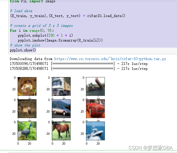 Running the code create a 3 X 3 plot of photographs. The images have been scaled up from their small 32 X 32 size, but you can clearly see trucks horses and cars. You can also see some distortion in the images that have been forced to the square aspect ratio.