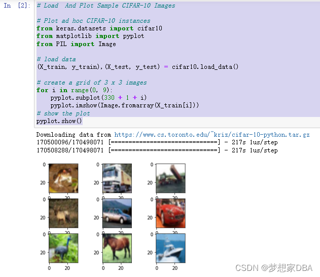 这段代码展示了如何利用Keras库加载CIFAR-10数据集,并通过matplotlib和PIL库显示其中的9张样本图像,创建了一个3x3的图像网格。