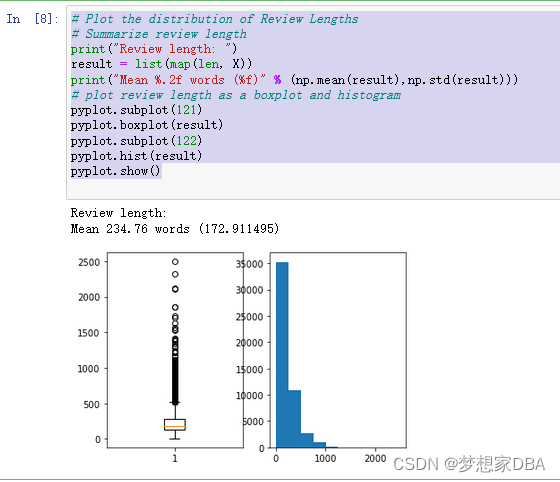 这段代码展示了如何使用Python的numpy和pyplot库来分析评论长度。首先,它计算了评论的平均长度及其标准差。然后,通过创建一个盒图和直方图来可视化这些长度,帮助理解数据分布。修改后的代码将`map`结果转换为列表,以便于后续的可视化操作。