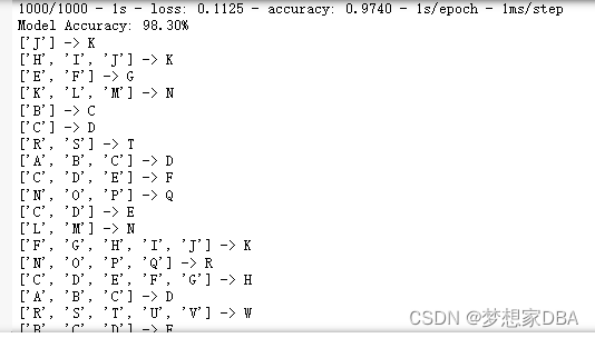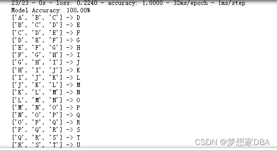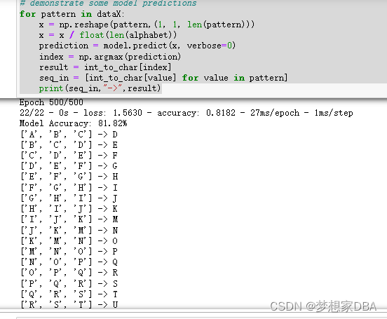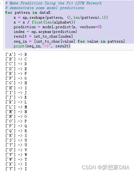 The trained model is evaluated on randomly selected input patterns. This could just as easily be new randomly generated sequences of characters. I also believe this could also be a linear sequence seeded with A with outputs fed back in as single character inputs. The full code listing is provided below for completeness.