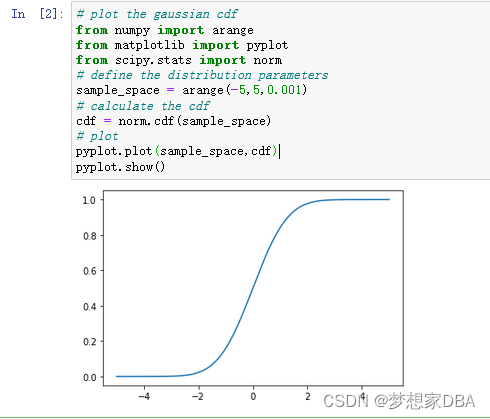The norm.cdf() function can be used to create a Gaussian cummulative density function. The example below creates a Gaussian CDF for the same sample space.