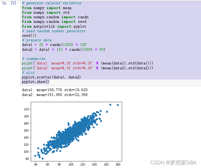 Before we look at correlation methods, let’s define a dataset we can use to test the methods. We will generate 1,000 samples of two two variables with a strong positive correlation. The first variable will be random numbers drawn from a Gaussian distribution with a mean of 100 and a standard deviation of 20. The second variable will be values from the first variable with Gaussian noise added with a mean of a 50 and a standard deviation of 10. We will use the randn() function to generate random Gaussian values with a mean of 0 and a standard deviation of 1, then multiply the results by our own standard deviation and add the mean to shift the values into the preferred range. The pseudorandom number generator is seeded to ensure that we get the same sample of numbers each time the code is run.