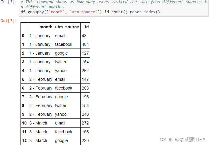 df.groupby(['month', 'utm_source']).id.count().reset_index()