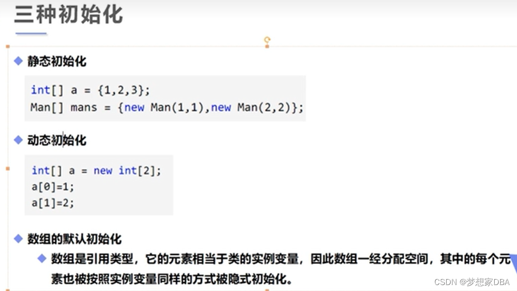 数组是引用类型,它的元素相当于类的实例变量,因此数组一经分配空间,其中的每个元素也被按照实例变量同样的方式被隐式初始化