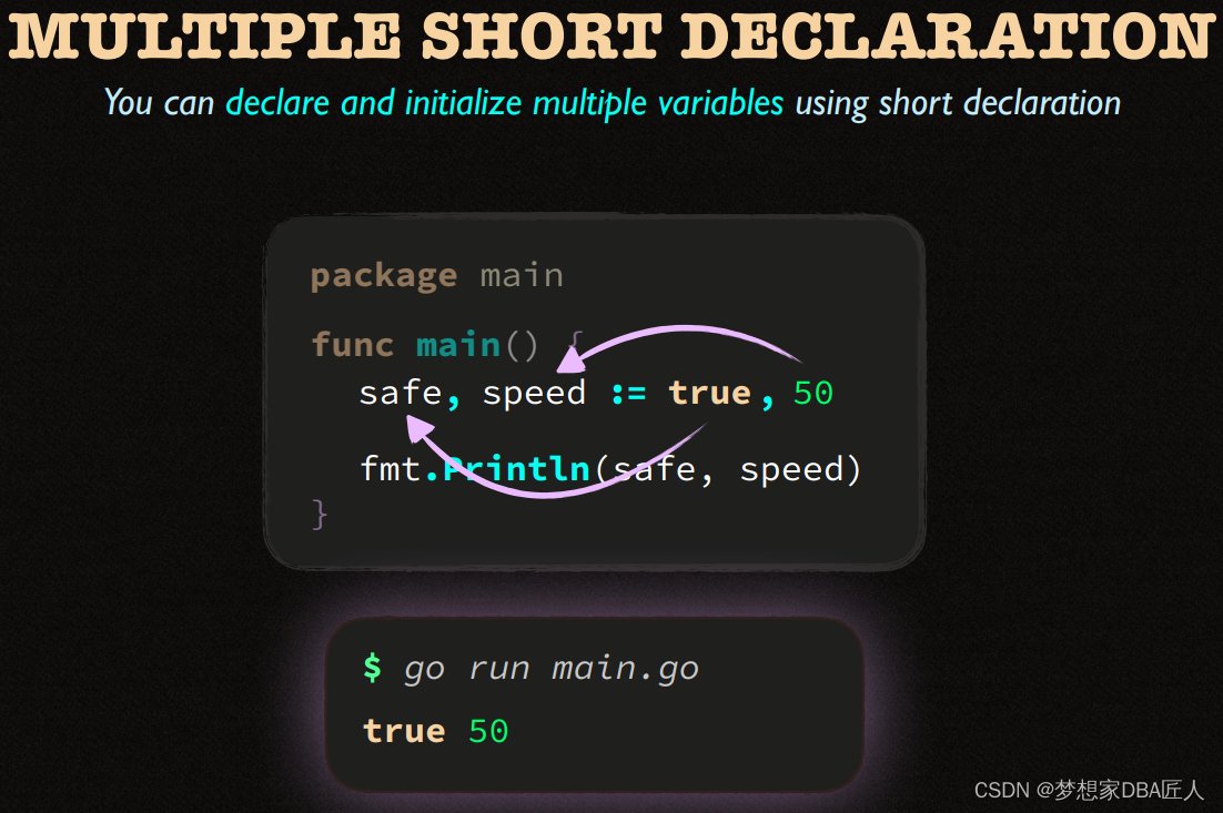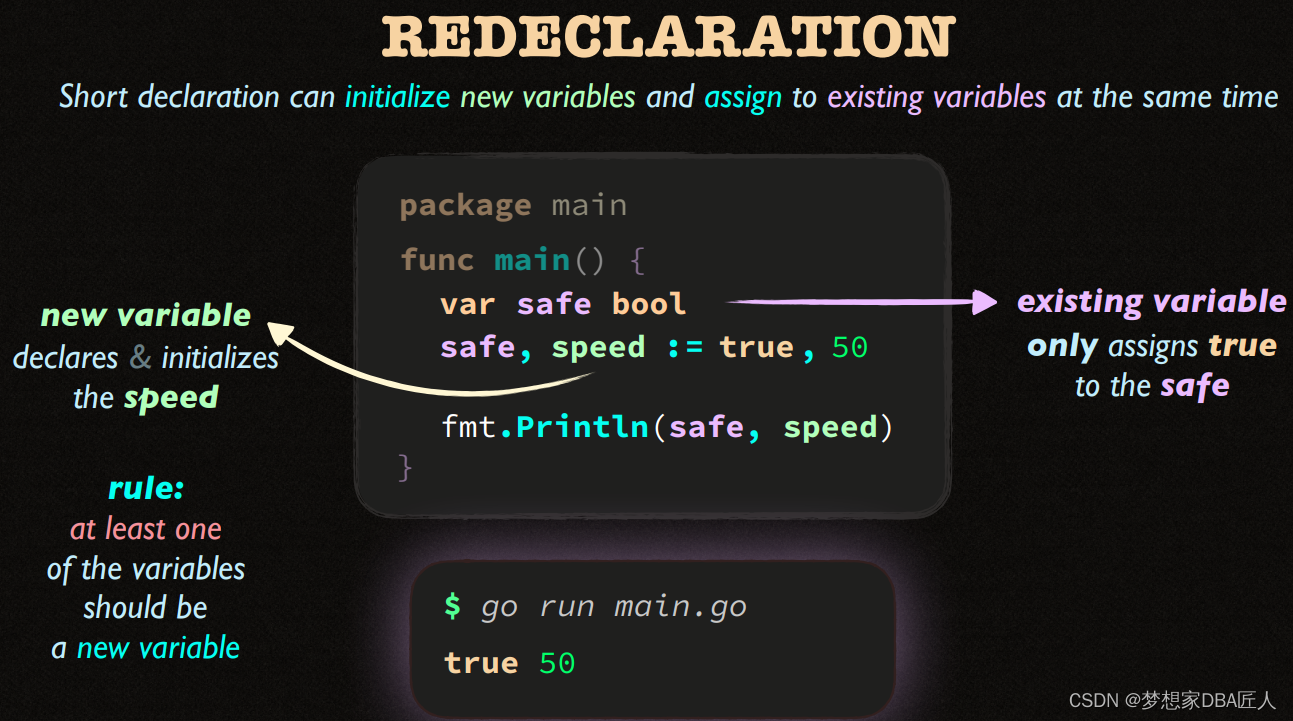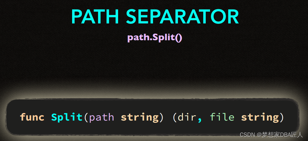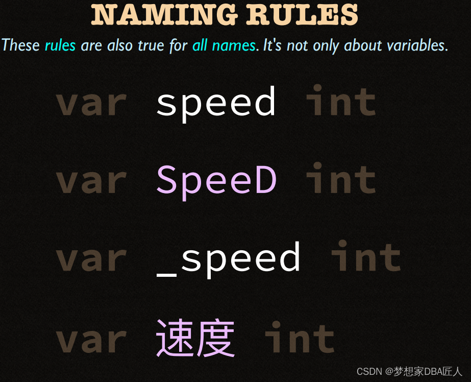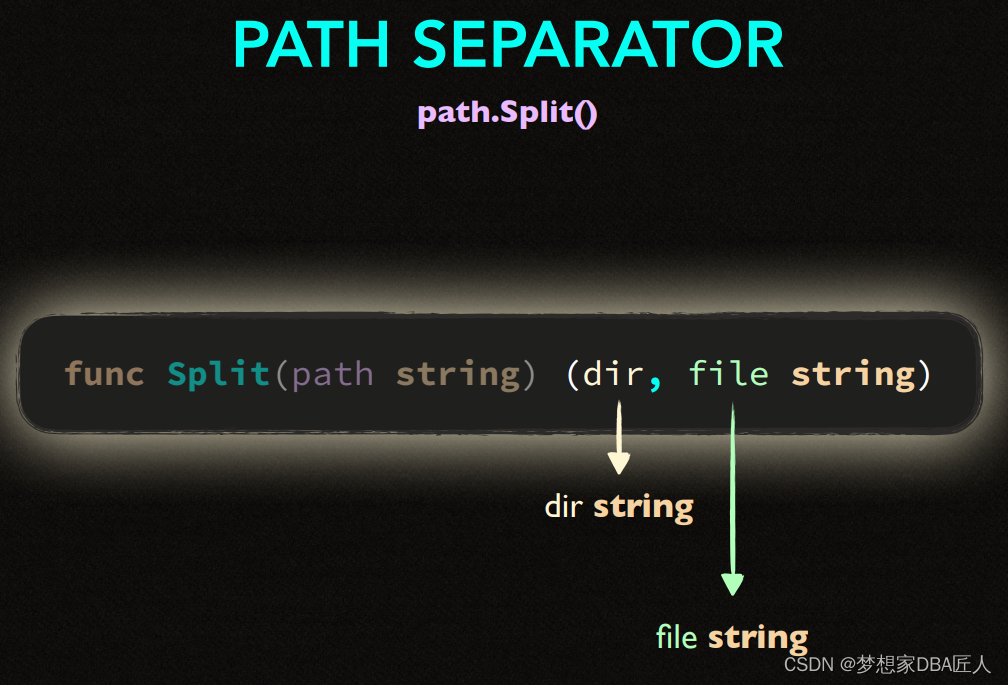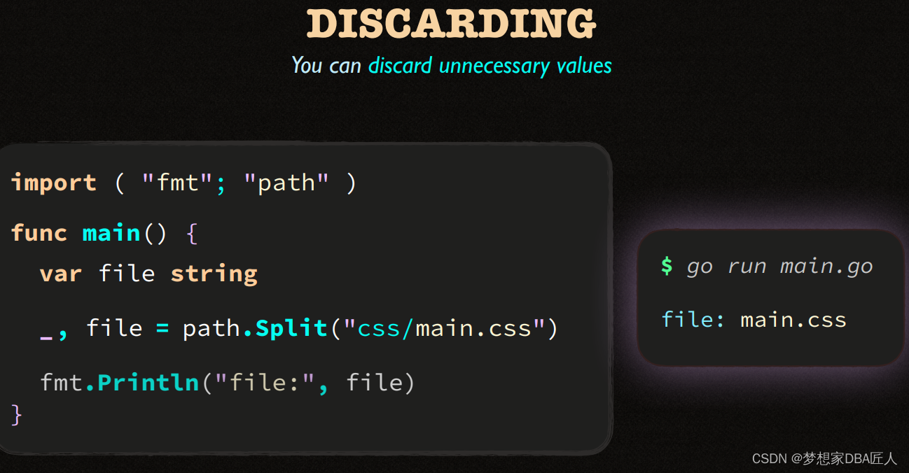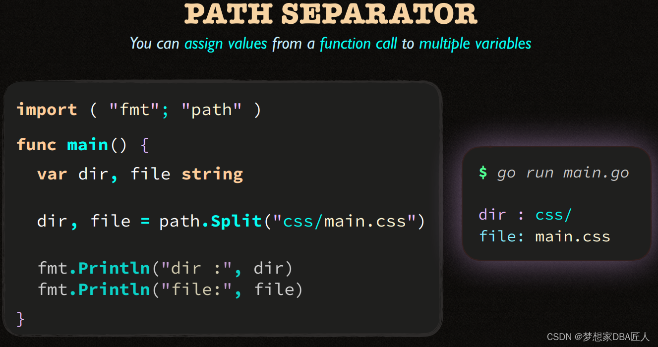 该文展示了两个Go语言代码片段,第一个例子中,使用`path.Split`函数从路径字符串css/main.css中提取了文件名。第二个例子则是一个简单的变量声明,展示了如何声明一个整型变量`spped`。此外,文中还提到了命名规则的概念,暗示可能在讨论Go语言的命名规范。