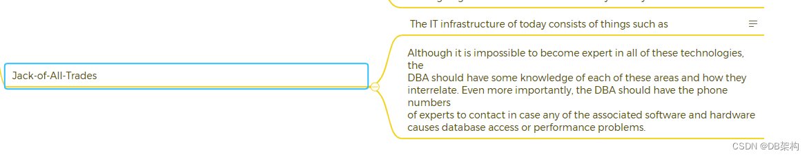 As a result, the DBA must be able to function as a jack-of-all-trades because they need to have a broad and deep understanding of various aspects of the database system, as well as the ability to work with different technologies, tools, and platforms. They need to be proficient in multiple programming languages, operating systems, network technologies, and database management systems, among other things.