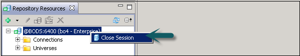 When you close Information Design tool, all the active sessions are automatically closed. To close a session individually, right-click on the session name and click Close.
