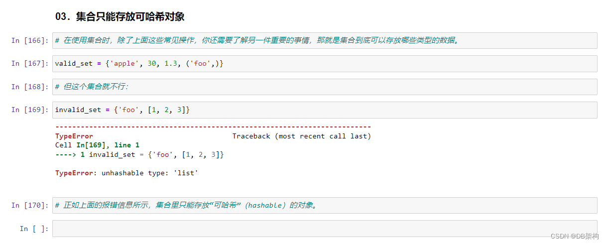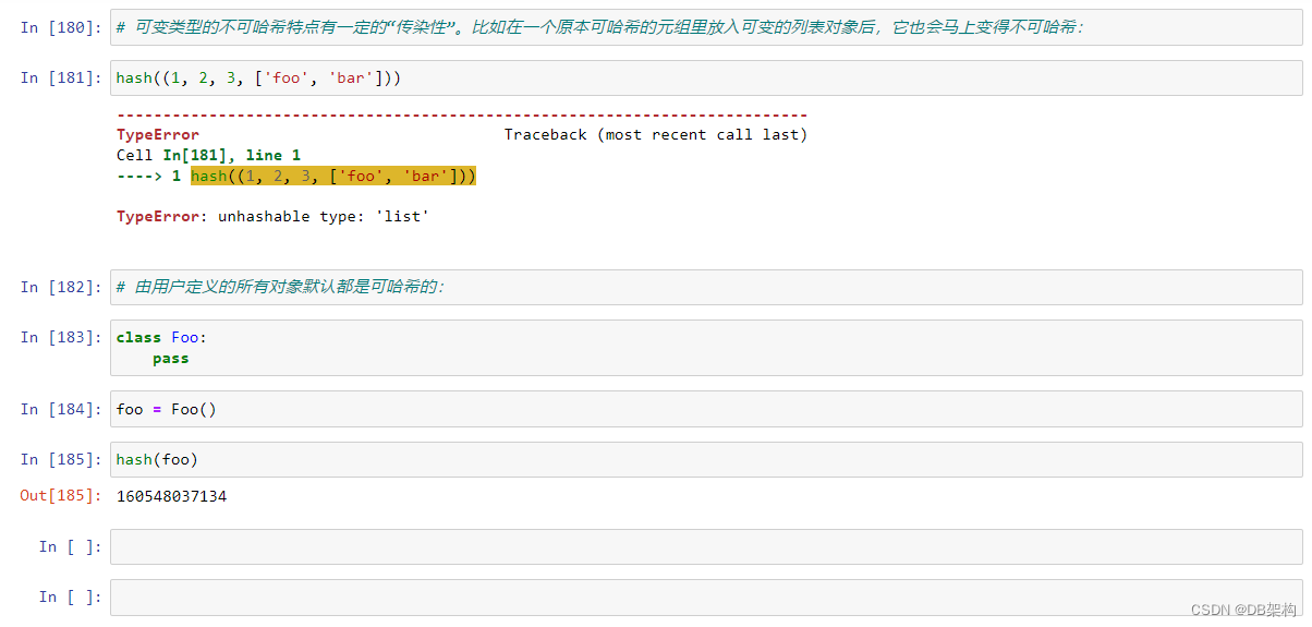 在介绍字典类型时,我们说过字典底层使用了哈希表数据结构,其实集合也一样。当我们把某个对象放进集合或者作为字典的键使用时,解释器都需要对该对象进行一次哈希运算,得到哈希值,然后再进行后面的操作。这个计算哈希值的过程,是通过调用内置函数hash(obj)完成的。如果对象是可哈希的,hash函数会返回一个整型结果,否则将会报TypeError错误。因此,要把某个对象放进集合,那它就必须是“可哈希”的。话说到这里,到底哪些类型是可哈希的?哪些又是不可哈希的呢?我们来试试看。