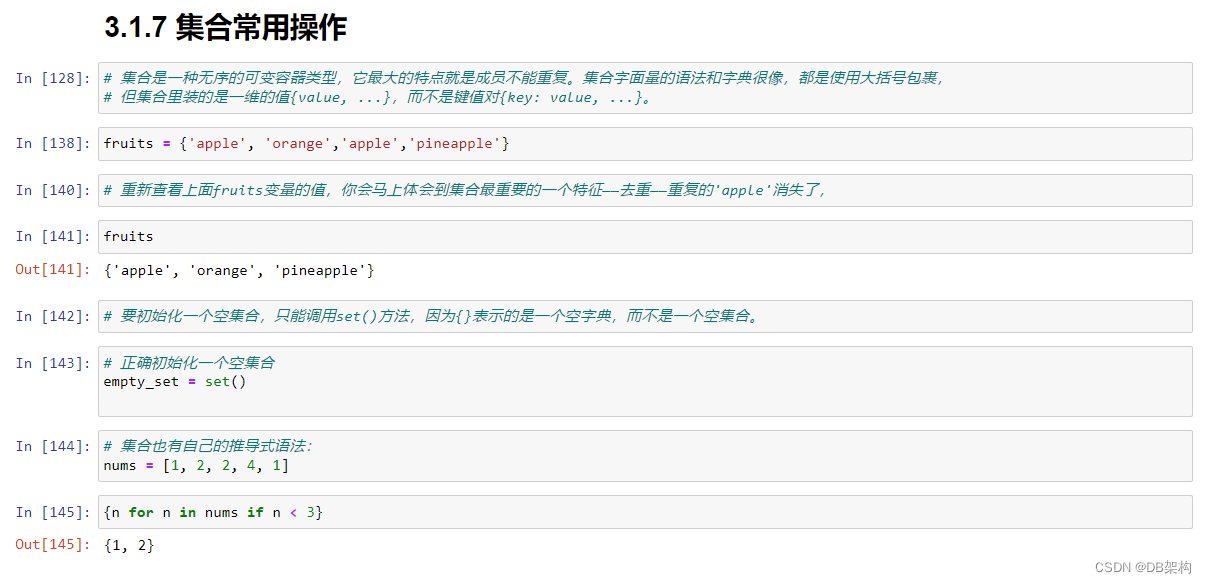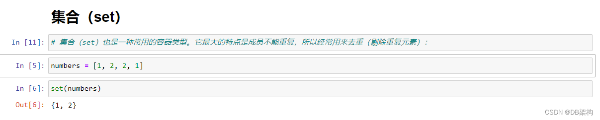 集合(set)也是一种常用的容器类型。它最大的特点是成员不能重复,所以经常用来去重(剔除重复元素):