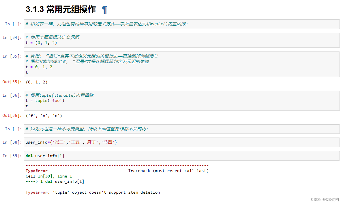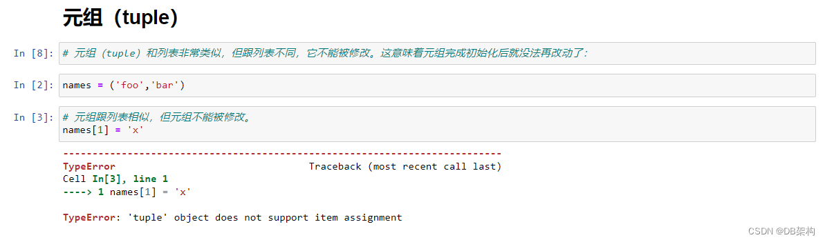 元组(tuple)和列表非常类似,但跟列表不同,它不能被修改。这意味着元组完成初始化后就没法再改动了: