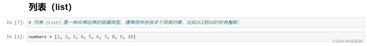 列表(list)是一种非常经典的容器类型,通常用来存放多个同类对象,比如从1到10的所有整数: