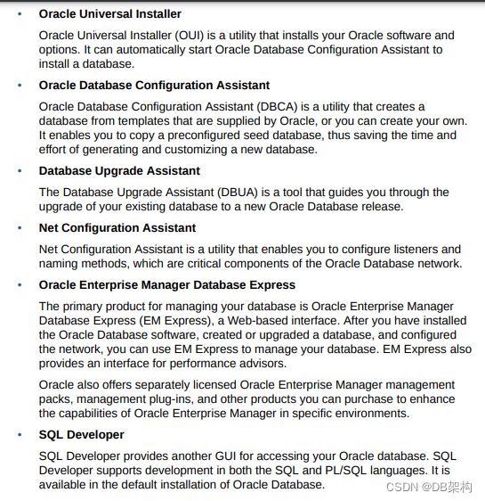 - Oracle Universal Installer(OUI): OUI is a graphical user interface utility that enables you to install new Oracle Database software.