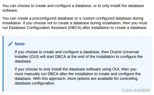 - OUI automatically starts Oracle Database Configuration Assistant(DBCA) to guide you through the process of creating and configuring a database.