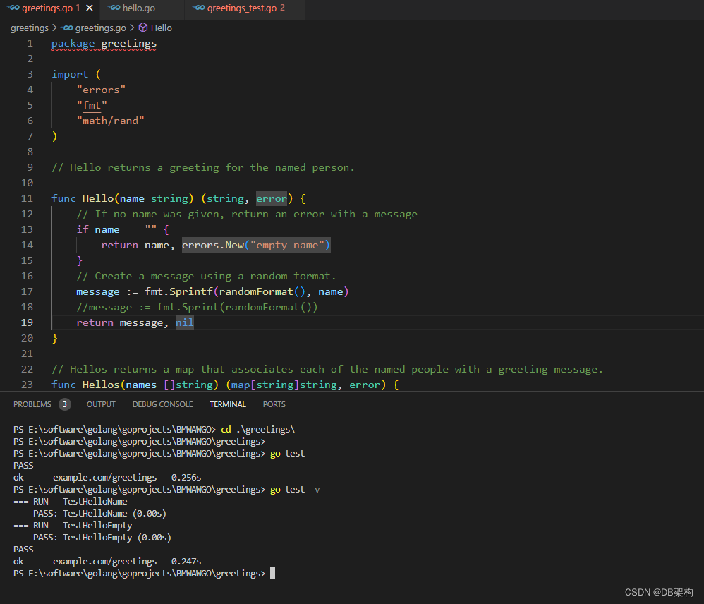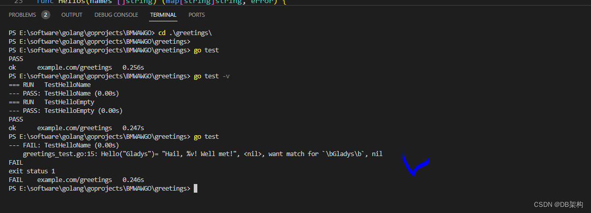 3.At the command line in the greetings directory, run the go test command to execute the test.