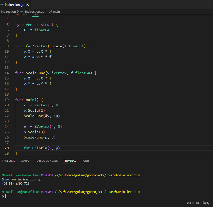 With a value receiver, the Scale method operates on a copy of the original Vertex value. (This is the same behavior as for any other function argument.) The Scale method must have a pointer receiver to change the Vertex value declared in the main function.