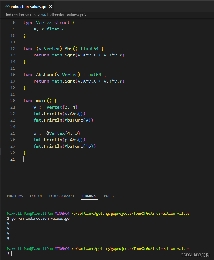 var v Vertex fmt.Println(AbsFunc(v)) // OK fmt.Println(AbsFunc(&v)) // Compile error!