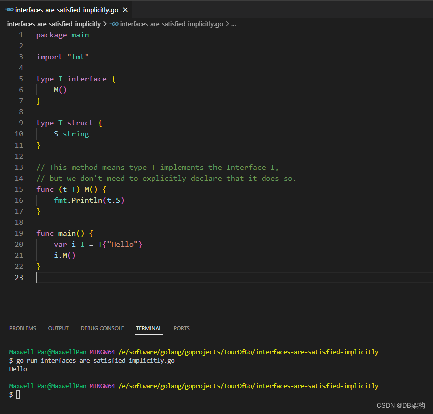 A type implements an interface by implementing its methods. There is no explicit declaration of intent, no "implements" keyword.