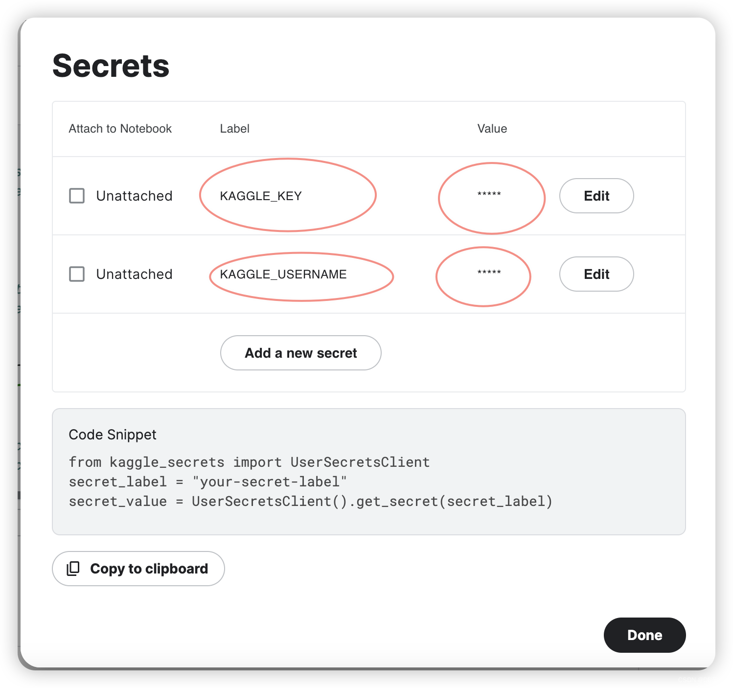 step2: Set environment variables for KAGGLE_USERNAME and KAGGLE_KEY. When prompted with the "Grant access?" messages, agree to provide secret access.