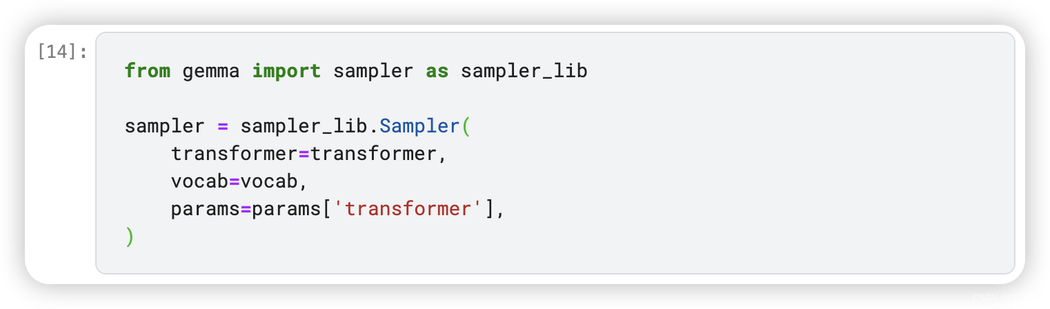 samplerwith gemma.sampler.Sampler on top of the Gemma model checkpoint/weights and the tokenizer: