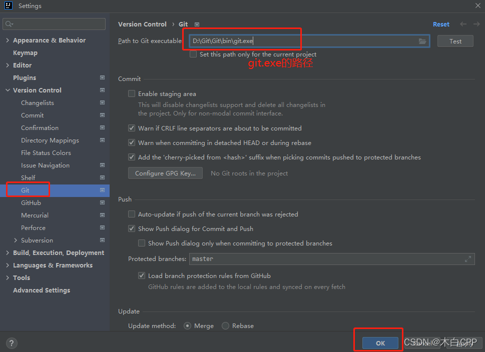 点开file->setting->Git,然后输入git.exe文件的地址即可