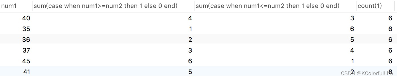 ,sum(case when num1>=num2 then 1 else 0 end)