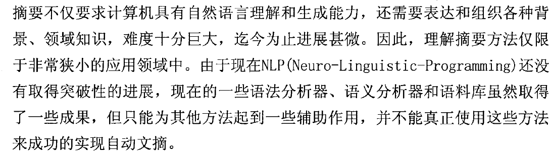 自动摘要方法分析 目前自动摘要方法可以概括为四类机械摘要、基于理解的自动摘要、信息抽取和基于结构的自动摘要。