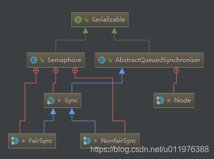 * 从类图中可以看到,Semaphore 内部定义了内部类 Sync。与之前分析的其他线程同步工具一样,Sync 类继承自AQS,并派生出两个子类 FairSync(公平锁)和 NonfairSync(非公平锁)。所以,Semaphore 的线程通信也是基于AQS完成