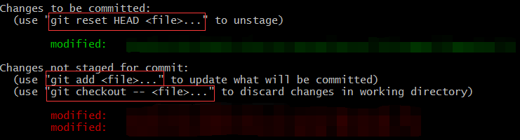 当使用 git status 查看当前分支的文件状态时,对于不同的文件状态,git status 会提示该状态下的文件可以使用的对应 git 命令,如下图所示。