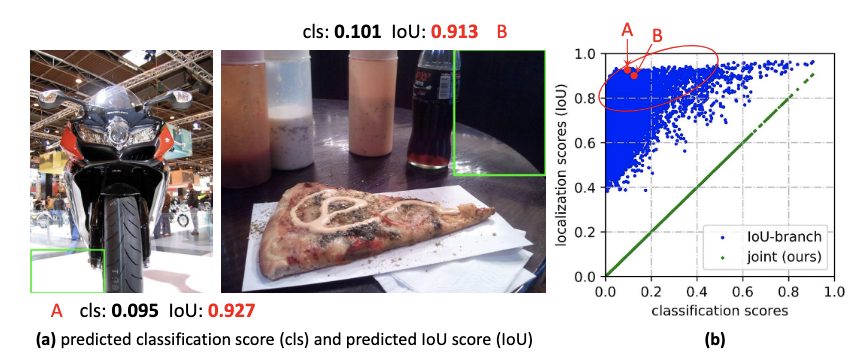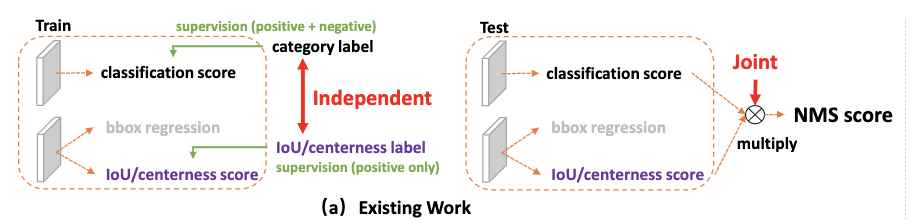 定位质量估计和分类分数实际不兼容:首先,定位质量估计和分类分数通常是独立训练的,但在推理时却合并使用。其次,定位质量估计只使用正样本点进行训练,导致负样本点可能估计了高定位质量,这种训练和测试的差异会降低检测的性能。
