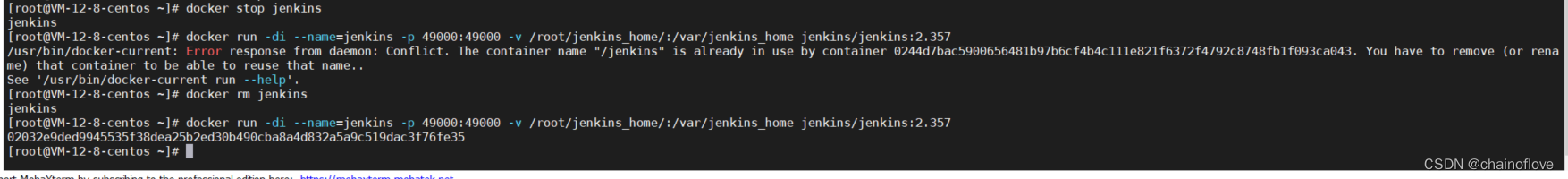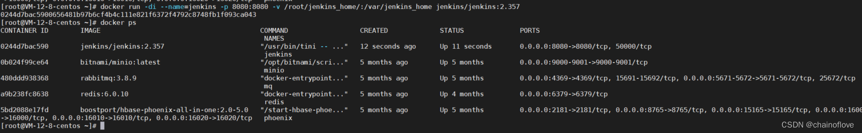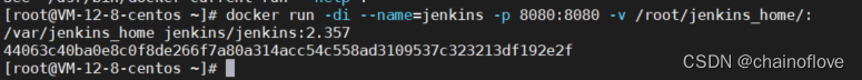 4、docker run -di --name=jenkins -p 9090:8080 -v /root/jenkins_home/:/var/jenkins_home jenkins/jenkins:2.357