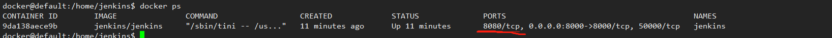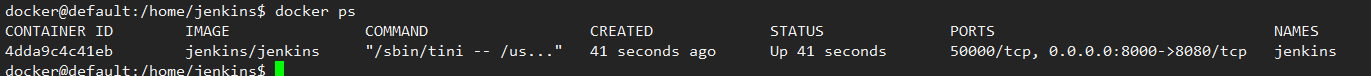 - docker run --name jenkins -u root -p 8000:8080 -d -v /home/jenkins:/var/jenkins_home jenkins/jenkins