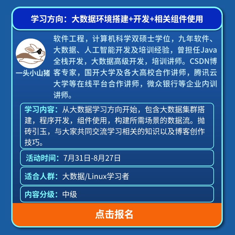 个人简介:在下"小山猪",软件工程+计算机科学双硕士学位。国内985+211研究生毕业,留美完成第二硕士学位。资深开发者,全栈开发工程师,大数据高级开发工程师。大数据金牌讲师,知名机构合作讲师,各云大学及平台合作讲师,自由创业者,CSDN博客专家。编程路上遇到的问题可以直接私信,然后文章视频马上安排!其它合作交流请添加主页微信,也欢迎加入文章结尾-官方粉丝微信群。