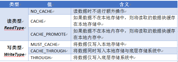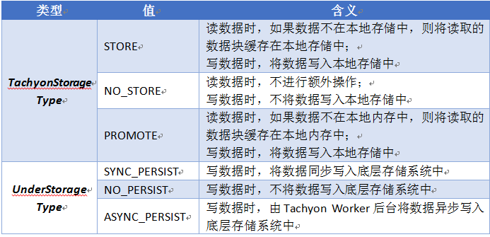 为了充分利用多层次的存储资源和底层存储系统,Tachyon为用户提供了不同的读写类型(ReadType/WriteType)API,用于灵活控制读写数据时的行为方式,不同的读写类型及其含义如表1所示