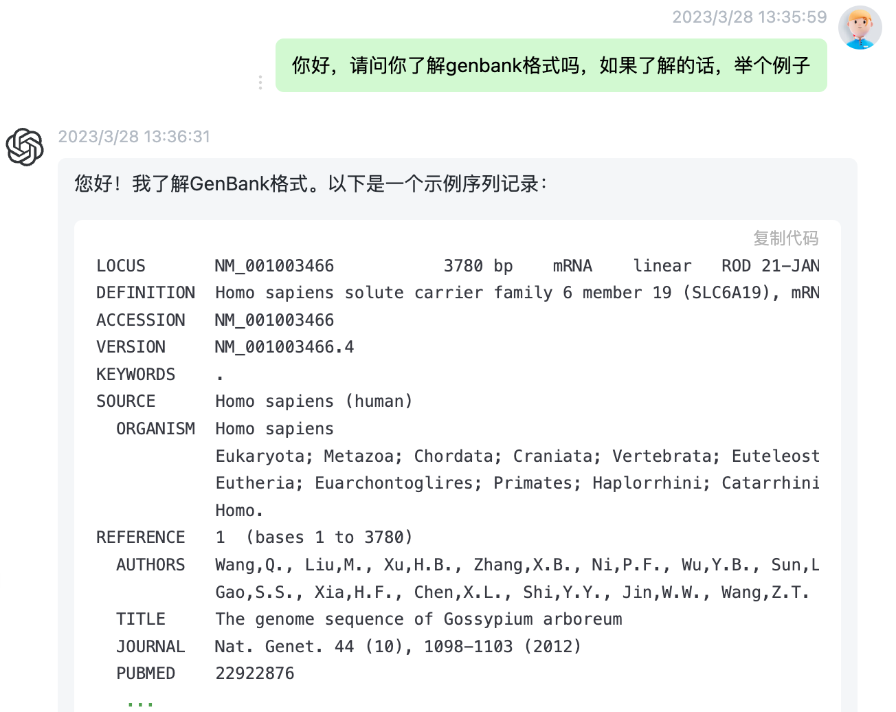 首先,我问了它关于genbank的格式定义,确保它后续能够进行处理。他的回答非常正确,符合我的认知(下面是对话截图)