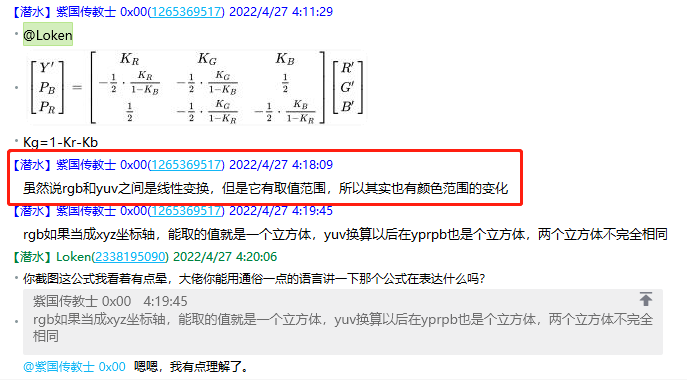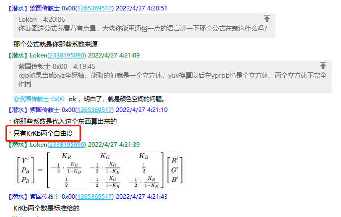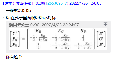 因为某些原因,亮度这个信息,不能完完全全 从 RGB 里面提取出来,总会残留一些亮度信息在 RGB 里面没提取到。所以 K 权重因子 根据不同标准也是不同的。