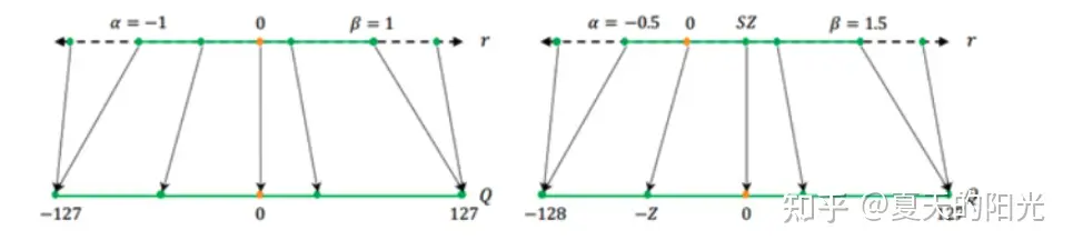 如下图所示,量化还可分为对称量化和非对称量化。量化前后0点的值不变的称为对称量化。但在实际过程中,量化的对象分布式不均匀的,不一定在0点值两边对称,所下图右侧所示,量化前后0点的值不同的称为非对称量化。
