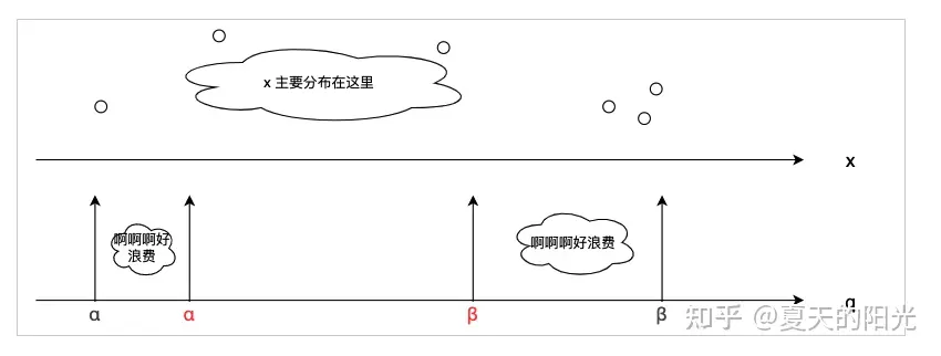 clip操作:其实就是切片操作,如何来选择这个量化对象的范围。为什么要选这个范围呢,因为量化到n位数后,可以用来表示量化后的整型值就是固定的,只有 2^N 个,这么有限的数据,怎么才能更好去映射原来的浮点值分布呢?这个范围选的太大了(按照原来的最大最小值来选,如下图所示),此时如果在头尾的浮点值只有零星的几个,而且距离其他值非常远,(如果此时是均匀量化)那么这个对于图中 α-α,β-β的离散值可能就被浪费了,这样浮点值到整型值的映射后导致的误差可能就会很大。这个取值是门艺术,大了浪费比特位,小了把就把太多有用信息“切”掉。