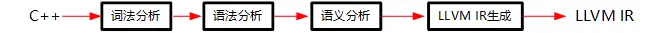 经过词法分析、语法分析、语义分析、LLVM IR生产,最终将C++转化成后端认可的LLVM IR。