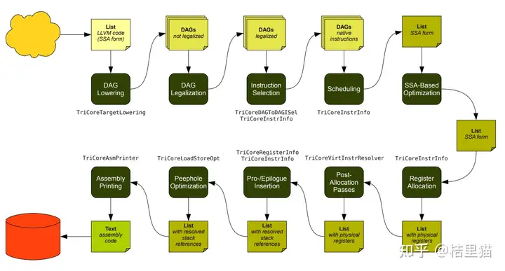 后端把你的LLVM转换成真正的汇编(或者机器码)。主要的流程如下。这个我们要重点讲讲,因为后续我们就是要实现一个这个东西支持一个新的芯片。