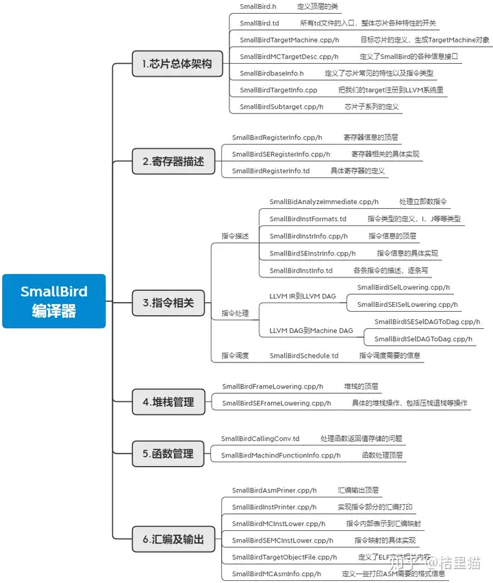 此处给我们的后端起个名字叫SmallBird。刚起这个名字的时候其实是有麻雀虽小五脏俱全的意思,但是后来写着写着看到这个名字,满脑子都想的是鸟的自由,看来最近感觉不自由Orz。SmallBird能够较为明显的区分我们写的东西和LLVM自带的东西。