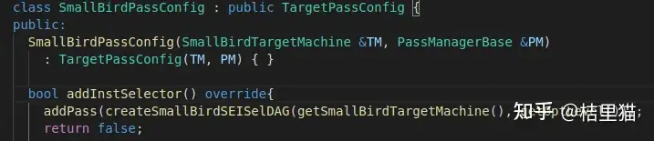 此处在C文件里直接实现SmallBirdPassConfig类,继承自TargetPassConfig, 用来配置我们Target的Pass。