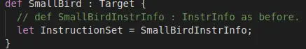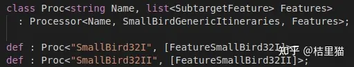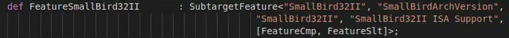 例如上面就定义了两个subtarget处理器,一个含有FeatureSmallBird32I特性,另一个含有FeatureSmallBird32II特性。